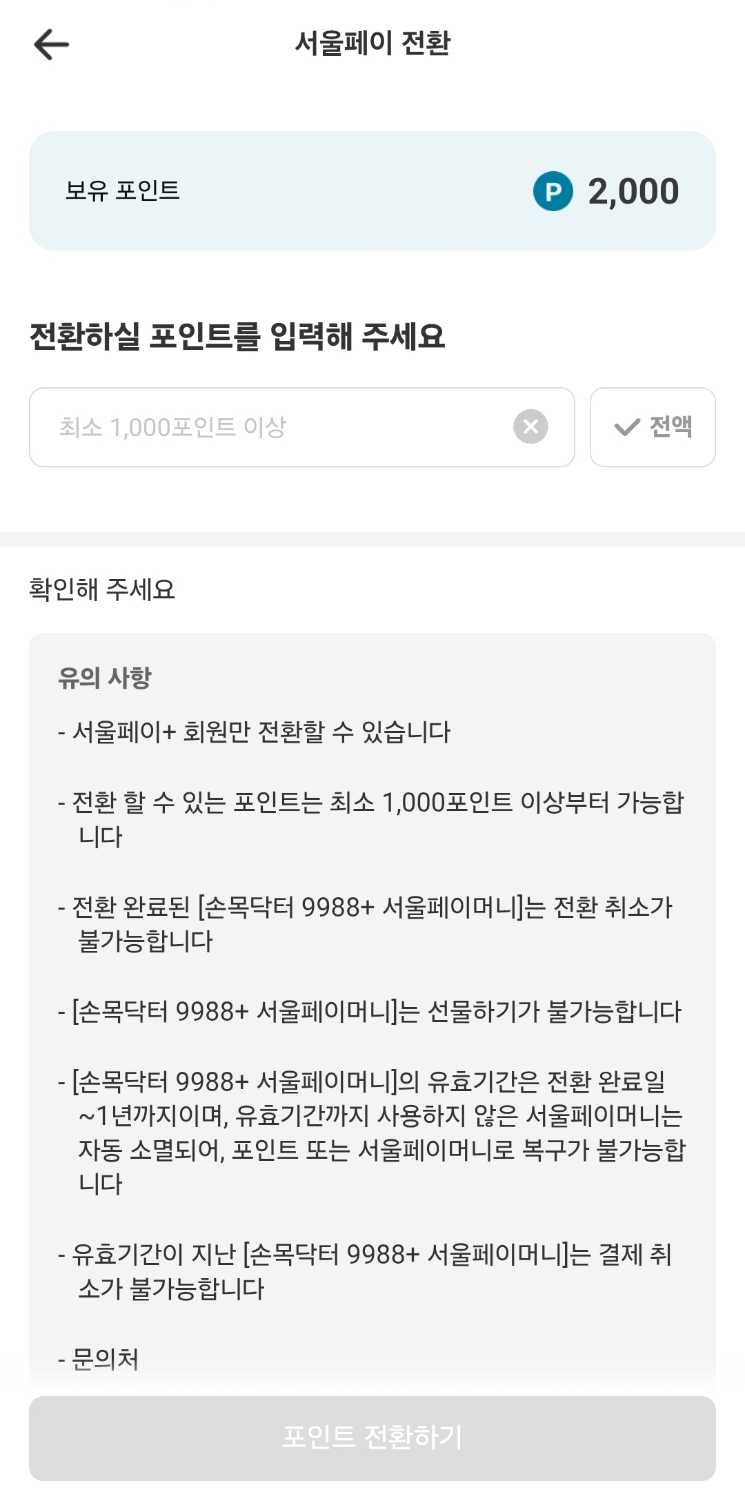 그리고 제일 중요한 서울페이 전환은 1천p 부터 변환이 가능합니다.